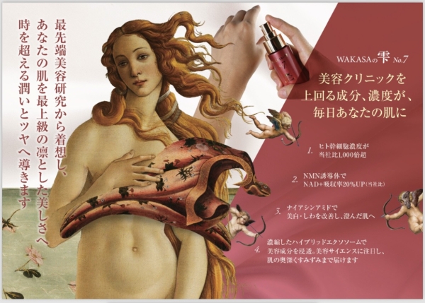 キングファルマより、現在注目のアンチエイジング成分「NMN」配合の 美容液と乳液一体型の化粧品がさらにグレードアップして誕生しました。7番目の商品、WAKASAの雫 No.7です。長年の研究を重ねて、一人でも多くの女性を美しく、幸せにしたいという願いを込めて開発しました。 つけた瞬間、そして翌朝の実感をぜひお試しください。